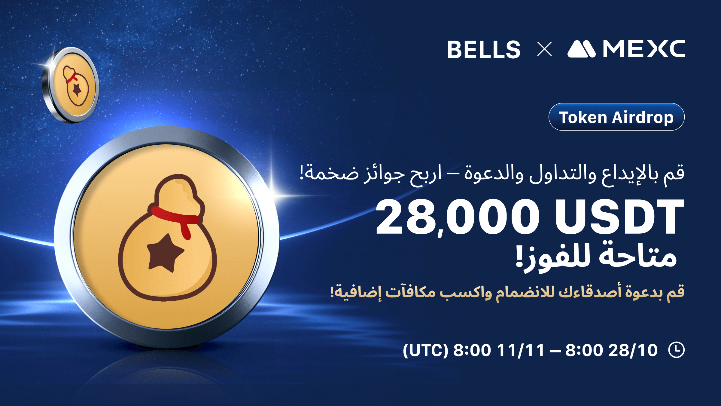 للاحتفال بإدراجBellscoin (BELLS)، تطلق MEXC حدثًا لمكافأة المستخدمين الجدد والحاليين. ندعوك بصدق للمشاركة! مكافآت بقيمة 28,000 USDT في انتظارك للفوز! تفاصيل الحدث هي كما يلي: