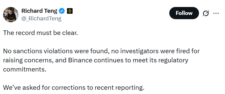 Richard Teng, Binance’s co-CEO, has denied the accusations. He said the company did not find sanctions breaches, and no employee has been fired for raising internal warnings. Binance added that a review conducted with outside legal advisors found no breach. The change maintains whistleblower protections and follows employment laws in the country where it operates.
