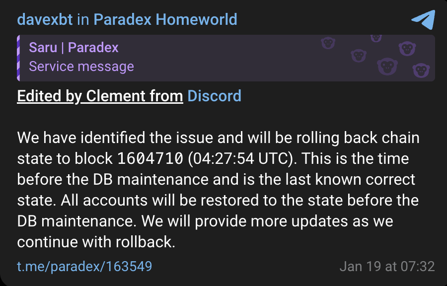 تقریباً سه ساعت پس از این رویداد، مدیر مهندسی پارادکس، کلمنت هو، در تلگرام به کاربران پرداخت و تأیید کرد که تیم مشکل را شناسایی کرده و وضعیت زنجیره را به بلوک 1,604,710، با برچسب زمانی 04:27:54 UTC باز خواهد گرداند.