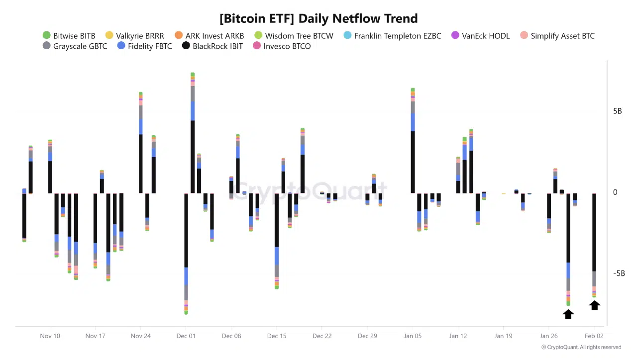 یک خروجی بزرگ در اواخر ژانویه ظاهر می‌شود که به دنبال آن یک خروجی دوم با اندازه مشابه در اوایل فوریه رخ می‌دهد. هر دو به عنوان عمیق‌ترین میله‌های منفی در نمودار برجسته هستند که نشان‌دهنده کاهش قابل توجه در پوزیشن ETF است به جای نوسانات معمول روزانه.