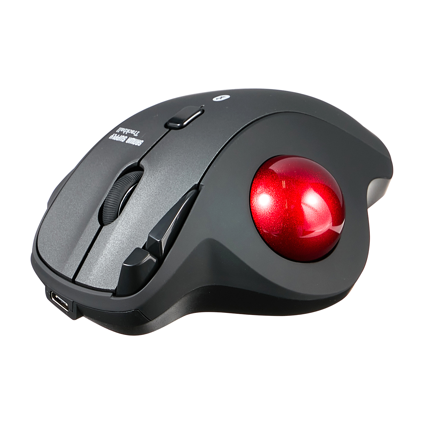 サンワサプライの「Bluetoothトラックボール MA-BTTB186BK」は、15度の傾斜角がついたエルゴノミクス形状に、約34mmのボールを搭載しています。カーソル感度を600~1600相当の4段階に切り替えられるDPIボタンを含め、計5つのボタンを装備。USB Type-Cケーブルで充電でき、連続使用時間は約20時間を公称しています。【フィット感やボールの動かしやすさのモニターコメント】サイズがちょうどよく、手のひらをそのまま置くと自然にフィットする。ボールがとても滑らかに動き、ぶれることなく思いどおりの方向へ操作できた。手のひらや小指の収まり具合はよいが、コンパクトなため手首が机にぶつかりやすいのが気になった。
