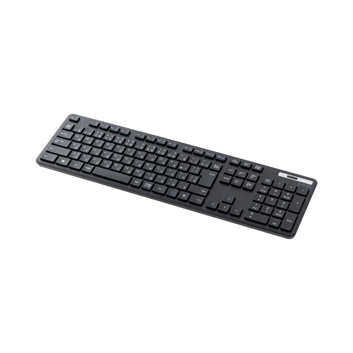 エレコムの「無線薄型フルキーボード TK-FDM110TXBK」は、テンキー付きのフルサイズキーボードで、電源スイッチや電池残量表示ランプも搭載しています。レシーバーをPCに挿すだけで接続でき、単4形乾電池1本で約2年間使用できる仕様です。キーストロークは2.5mmの薄型で、素早く軽い力でキー入力できるよう設計されています。打鍵感の好みを問わず快適にタイピングでき、打ち心地の検証では高評価を得ました。キーキャップにはわずかな凹みがあり、指がフィットしやすく快適に打てます。キーの大きさや隙間は適度で違和感が少なく、多くのモニターから高評価でした。一方で、打鍵感が軽すぎて手応えが弱めと感じる人も。傾斜やキー間隔については肯定的な意見が多いものの、「キーが薄くて凹みも少なく、指になじむ感覚が得られなかった」「底打ち感が気になった」という声もありました。静音性は優秀で、オフィスや図書館などでも周囲を気にせず使用できます。音が気になりにくいため、集中して作業に取り組みたい静音性重視な人におすすめです。