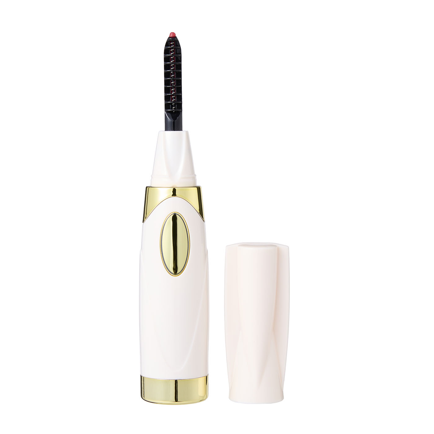 小泉成器の「アイラッシュカーラー」は、さまざまな家電用品を展開しているKOIZUMIのホットビューラー。ボリュームコームとセパレートコームの2種類のコームがついており、つけまつげにも使用できるのが特徴です。カール力の検証では、きれいなCカールに上がったため高評価を獲得しました。また、セパレートコームを使用すると、束にならずセパレートしたまつ毛に仕上がりました。しかし、6時間経過すると、カールがやや下がったため、カールキープ力のあるマスカラを併用するのがよいでしょう。使用感の検証では、ほとんどのモニターから「カーブがちょうどよくてまつ毛が上げやすかった」「まつ毛が逃げることなくしっかり拾えた」と好評でした。2種類のコームで、上げる用と仕上げ用で使い分けができるため、カールだけではなくまつ毛の形や仕上がりにこだわりたい人におすすめの商品です。適温になるとコーム付近の印の色が変わる点や、キャップを閉めると電源がオフになる仕様もうれしいポイントです。
