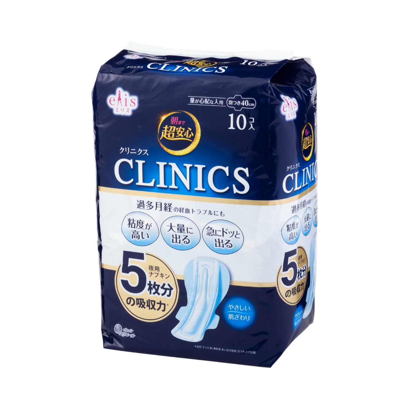 大王製紙の「エリス 朝まで超安心 クリニクス」は、過多月経の人のために設計された商品。夜用ナプキン5枚分相当を吸水すると謳っています。※大王製紙「新・素肌感29cm」との比較(2020年7月時点 大王製紙調べ)今回の吸水力の検証では、140mLを問題なくキャッチし高評価を獲得しました。しかし、マネキンにナプキンを装着したショーツを履かせた漏れにくさの検証では、110mLでお尻の後ろから漏れてしまったため、惜しくも満点には届きませんでした。使い心地の検証では、比較的長さがあるタイプなものの、スムーズに装着を行えたことがモニターから好評。しかし「厚めなので、ごわっと感があった」という意見が多数挙がったため、寝るだけとはいえお尻がモコモコとするのが苦手な人には不向きといえます。また、1枚あたり約68円と化学繊維のもののなかでも高値なのはネック。そのうえ1パックに10枚しか入っていないため、とくに量が多い日に限り使用するのがよいでしょう。