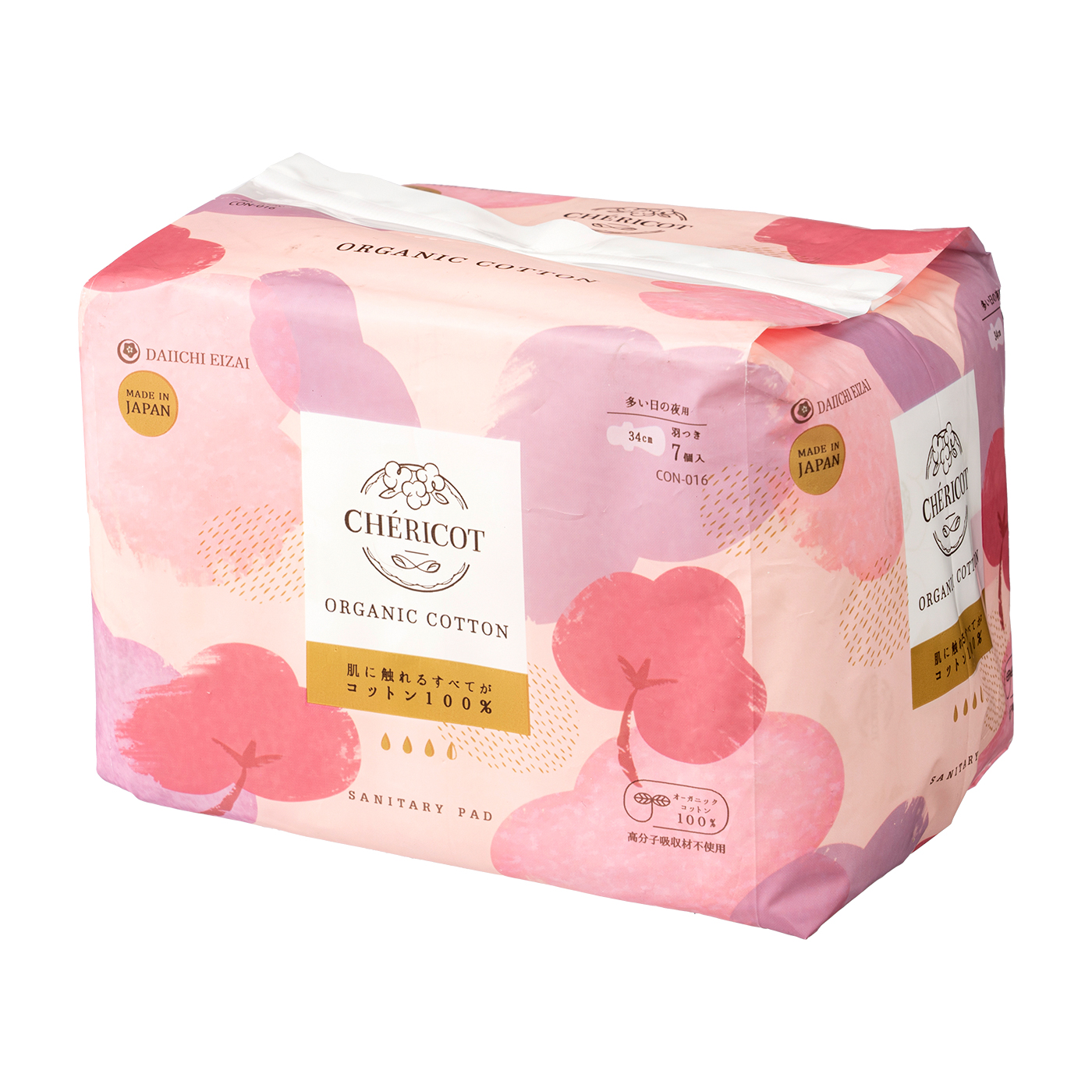 第一衛材の「シェリコット オーガニックコットン」は、シートにサイドガード加工が施されており、寝返りをうった際の横漏れを防ぐと謳った商品です。今回の吸水力の検証では、140mLを吸水しコットン素材のナプキンのなかで優れた吸水力を発揮しました。また漏れにくさの検証では、夜ナプキンの平均吸水量である80mLをしっかり吸水。しかし100mLを超えたところで、マネキンのお尻から横漏れしてしまったうえナプキンがビショビショになったため、とくに多い日の使用は避けたほうがよいといえます。使い心地の検証では、「分厚くてゴワゴワする」「お尻にフィットする感じがない」とマイナスの意見が多数挙がり、評価は惜しい結果に。また、1枚あたりの価格は約89円とコストがかかるうえ、7枚しかないのですぐになくなってしまう点はネックでしょう。しかし、化学繊維を使用した商品が苦手で、素材にこだわりたい人にはおすすめです。