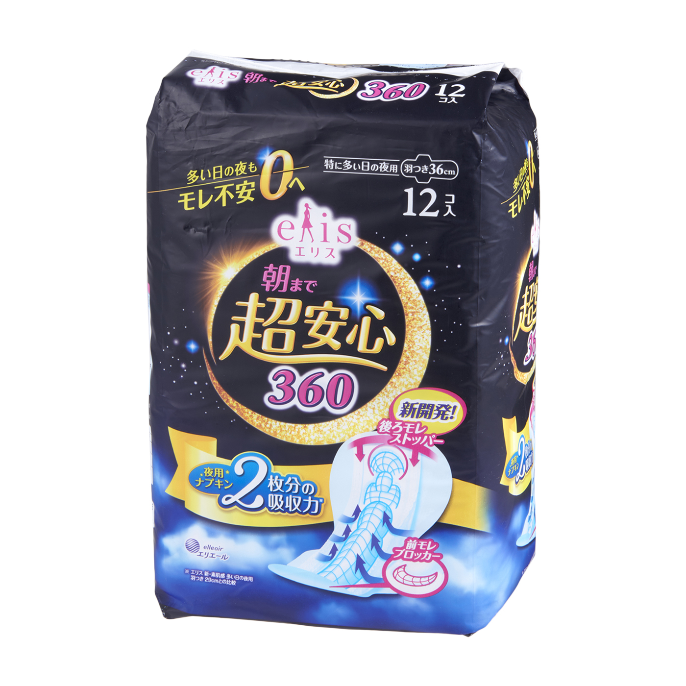 大王製紙の「エリス 朝まで超安心360」は、お尻の谷間に合わせて変形する全面フィット構造を採用し、隙間を作らずしっかりフィットすると謳った商品。お尻部分には後ろ漏れを防ぐガードが施されています。吸水力の検証では、今回の上限である140mLもの吸水量を記録したうえに、まだまだ余裕も残っていそうでした。さらに、マネキンにナプキンを装着したショーツを履かせた漏れにくさの検証でも、140mLまでしっかり吸水し高評価。寝返りをうっても漏れにくい商品といえます。使い心地の検証では、着脱のしやすさ・ずれにくさが加点となり高く評価されました。ショーツに装着した際にややもったりする感じはありますが、お尻まですっぽり隠れる長さと厚みがあり、後ろまでしっかりガードできるのはうれしいポイントでしょう。2022年9月に吸水力をリニューアルして夜用ナプキン2枚分の吸水量と謳っているとおり、睡眠中の漏れが気になる人におすすめしたい商品です。同メーカー エリス 新・素肌感 多い日の夜用 羽つき 29cmとの比較