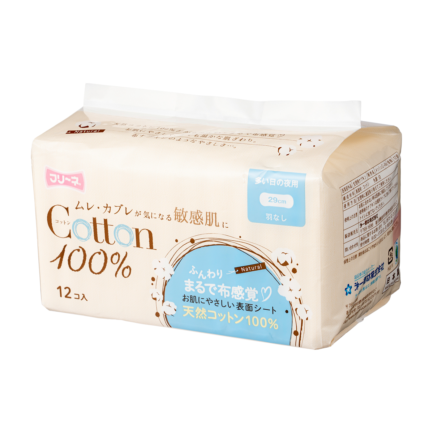 第一衛材の「フリーネ コットン100%」は、シート表面にコットンを使用しているため、布のようなふわふわとした触り心地が特徴です。今回の吸水力の検証と漏れにくさの検証では、100mLを吸水し高評価を獲得。表面は化学繊維のものに比べるとやや水分が残るものの、吸水力は劣らないうえ、横漏れしにくいことがわかりました。使い心地の検証では、「短いうえに羽がないので装着がスムーズに行えた」と着脱のしやすさの項目で高評価。しかし、「動くとずれる感じがする」という意見も挙がったため寝返りをよくうつ人には不向きでしょう。1枚あたり約55円と化学繊維のものと比べると高値ではありますが、今回検証したコットン素材の商品のなかでは購入しやすい価格です。コットン素材の夜用ナプキンを探している人は検討してみてくださいね。