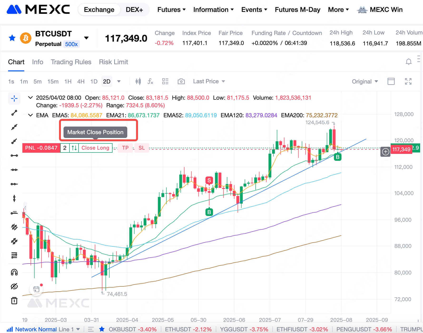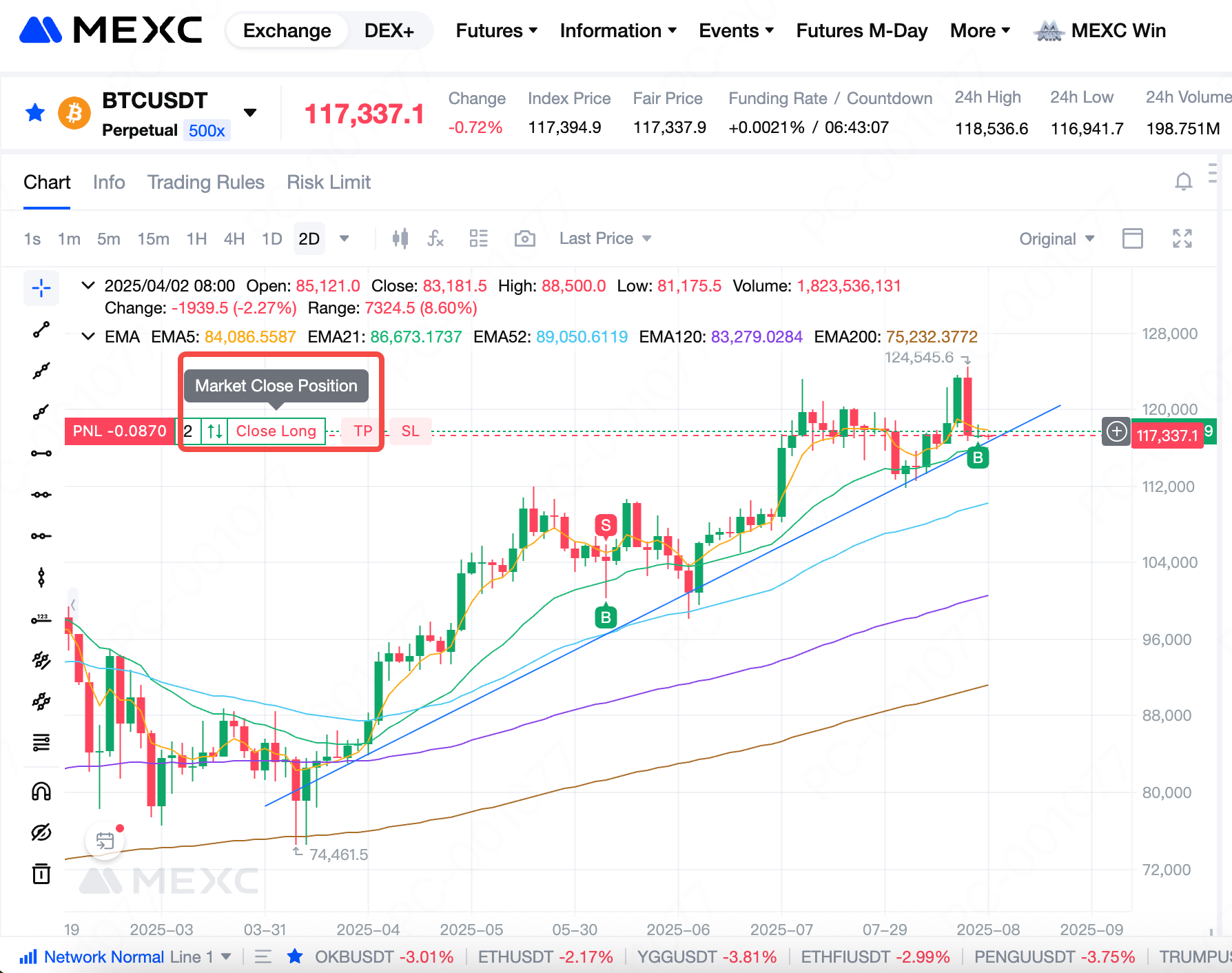 Trading directly on the candlestick chart allows users to more intuitively observe position changes and current market prices, adjust positions flexibly, and develop trading strategies. It also makes operations more convenient, helping users respond effectively to fast-moving market conditions. Compared with the order placement area, the candlestick chart functionality is relatively limited. For more complex trading strategies, users still need to operate within the order placement area.