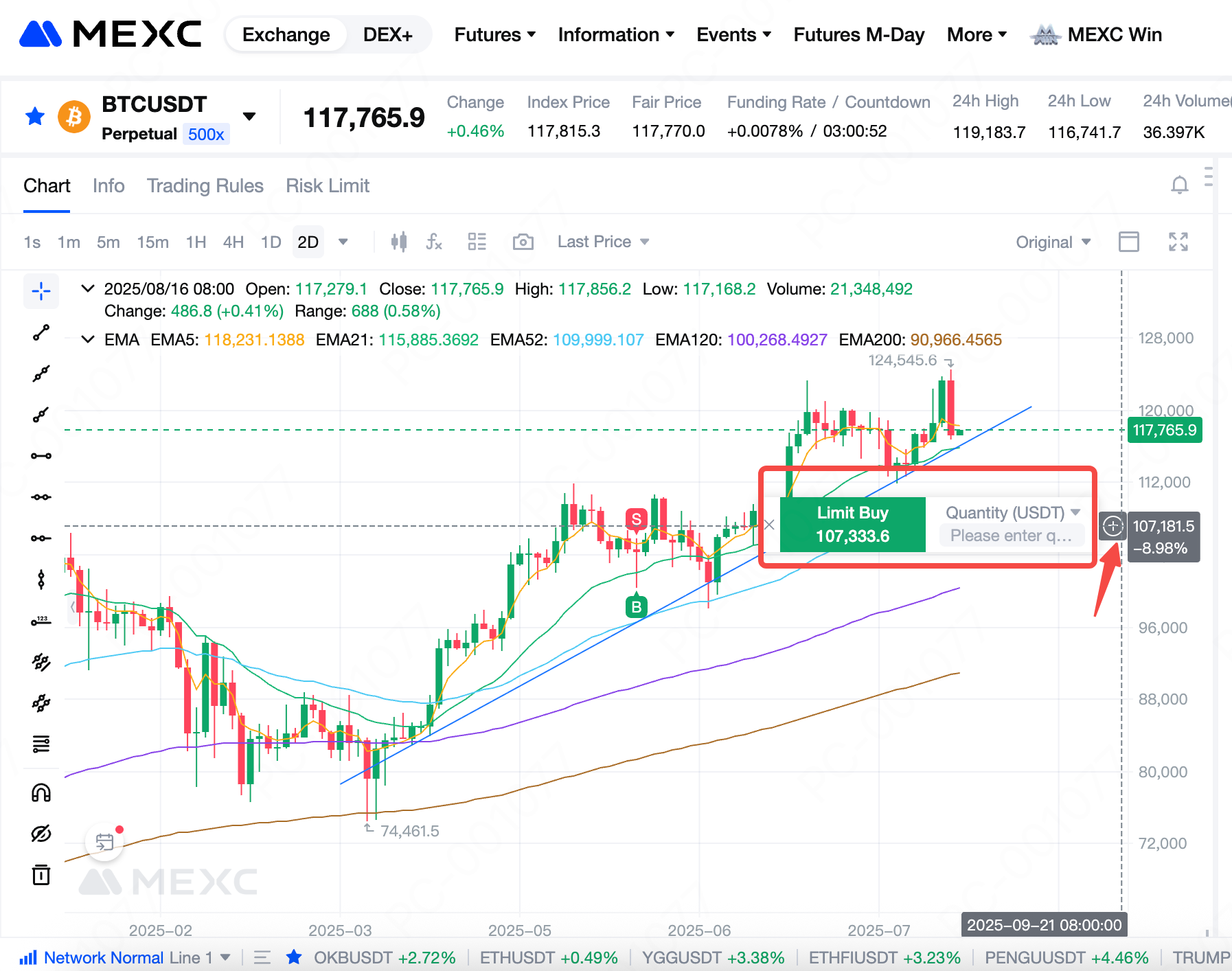 On the Futures trading page, hover your mouse over the candlestick chart, and a ⊕ icon will appear on the right. Click ⊕ to open the limit buy/sell input box. Enter the quantity and click the corresponding Limit Buy/Sell icon on the left to place the limit order. Note: Orders from the candlestick chart do not currently support selecting or adjusting margin mode or leverage; you must set these in the main order section beforehand.
