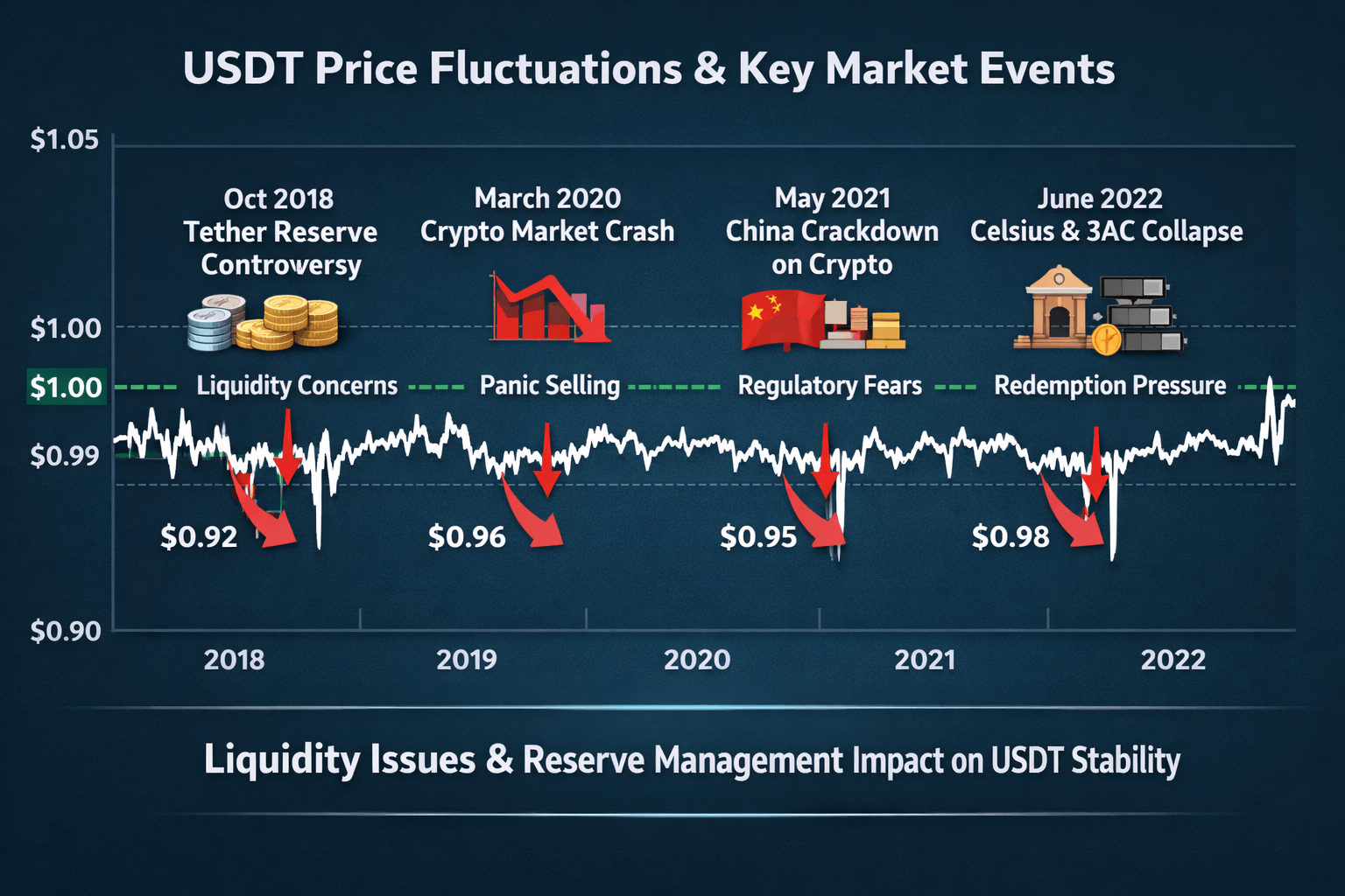 While USDT generally maintains its 1:1 peg, it has faced periods of temporary depegging. One of the most notable instances occurred during periods of market instability, where USDT price temporarily deviated from the US Dollar due to high demand for stable assets or liquidity constraints. This was particularly evident during periods of market stress, such as the 2020 crypto crash and fluctuations in 2021.