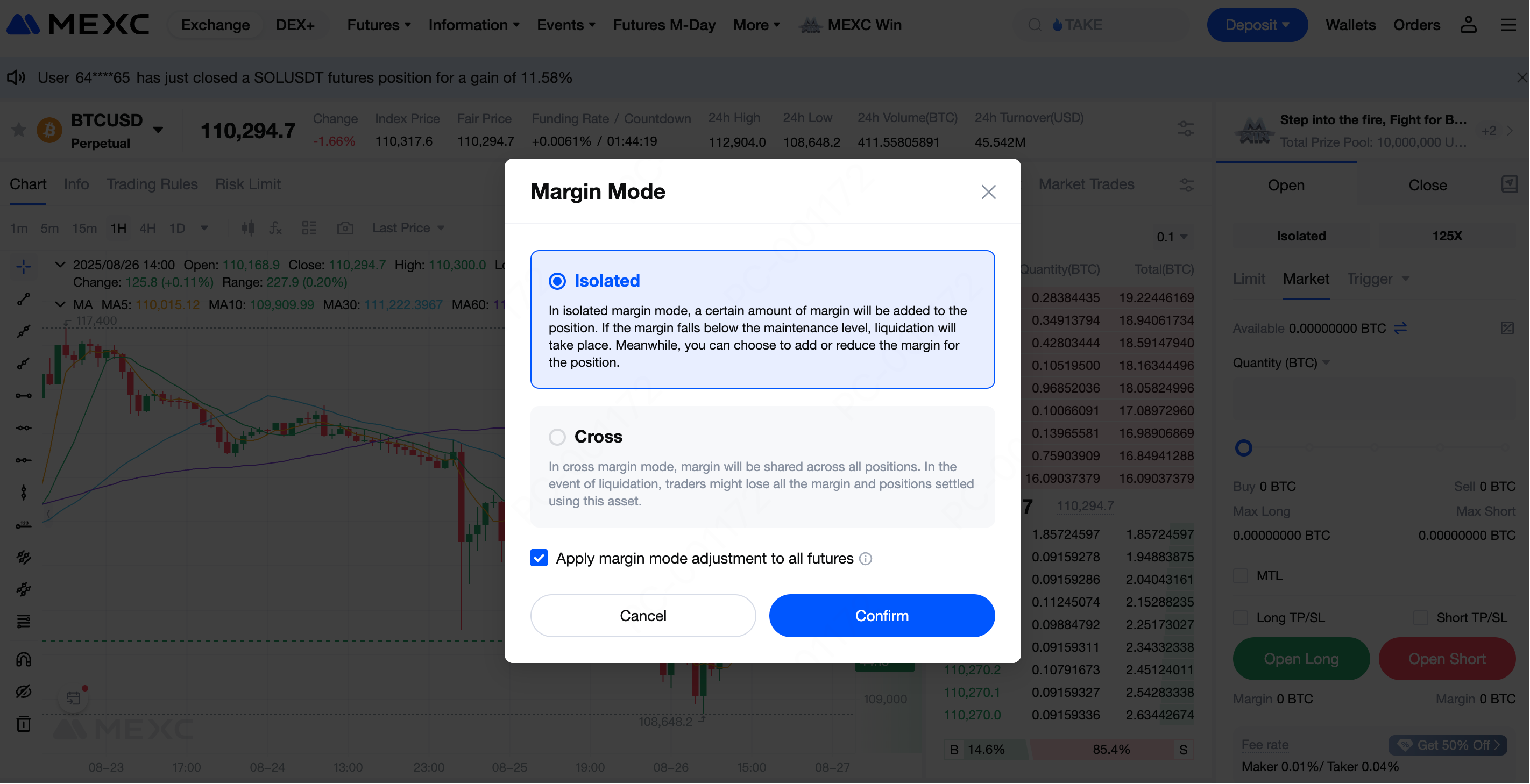 In terms of position mode and margin mode, MEXC Coin-M Futures operate in the same way as USDT-M Futures, supporting both Hedge Mode and One-Way Mode, as well as Cross Margin and Isolated Margin.