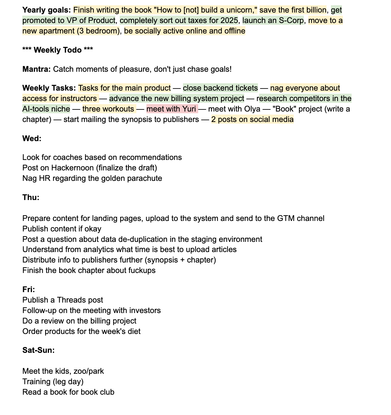 Why the colors? Every time I finish a week (and later, a year), I Ctrl+X and Ctrl+V the entire block to the end of the document. Over time, I’ve built an archive of "closed" weeks. I’ve currently logged over 200 weeks this way.