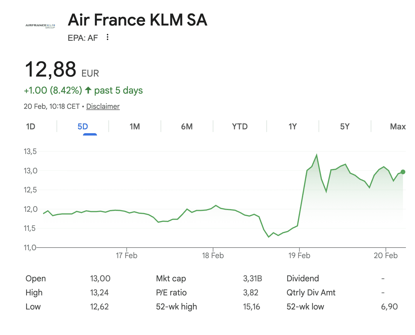 Het aandeel van Air France-KLM moet vandaag een daling van 0,77 procent slikken. Dat kleine verlies volgt echter op een gigantische stijging rondom de presentatie van de kwartaalcijfers. Het lijkt er daar dus vooral op dat beleggers even wat winst realiseren op dit aandeel.