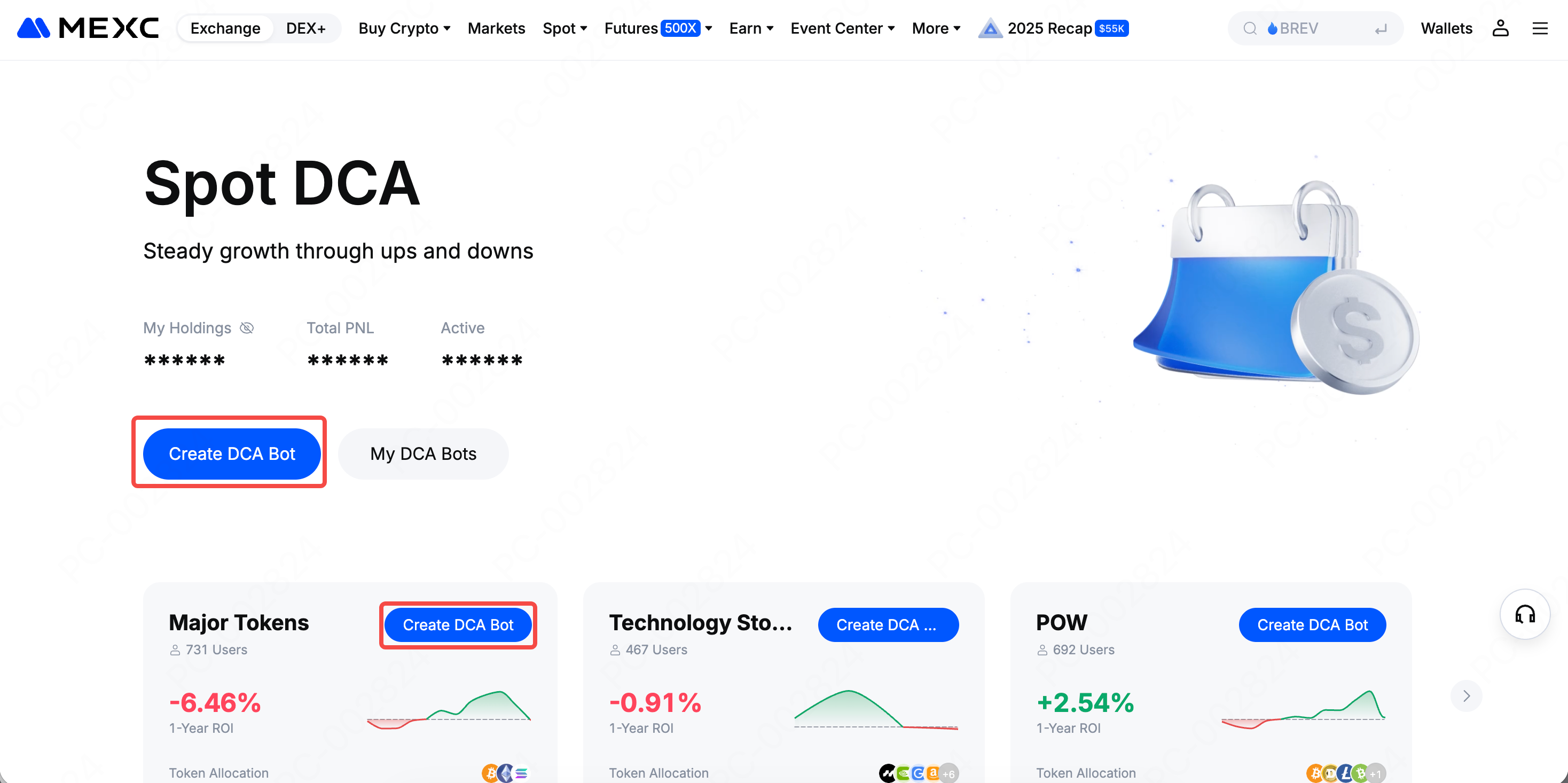 Na página DCA Spot, clique em Criar bot DCA. Como alternativa, navegue pelas Estratégias em Destaque ou Planos DCA, selecione sua criptomoeda preferida e clique em Criar bot DCA para configuração rápida.