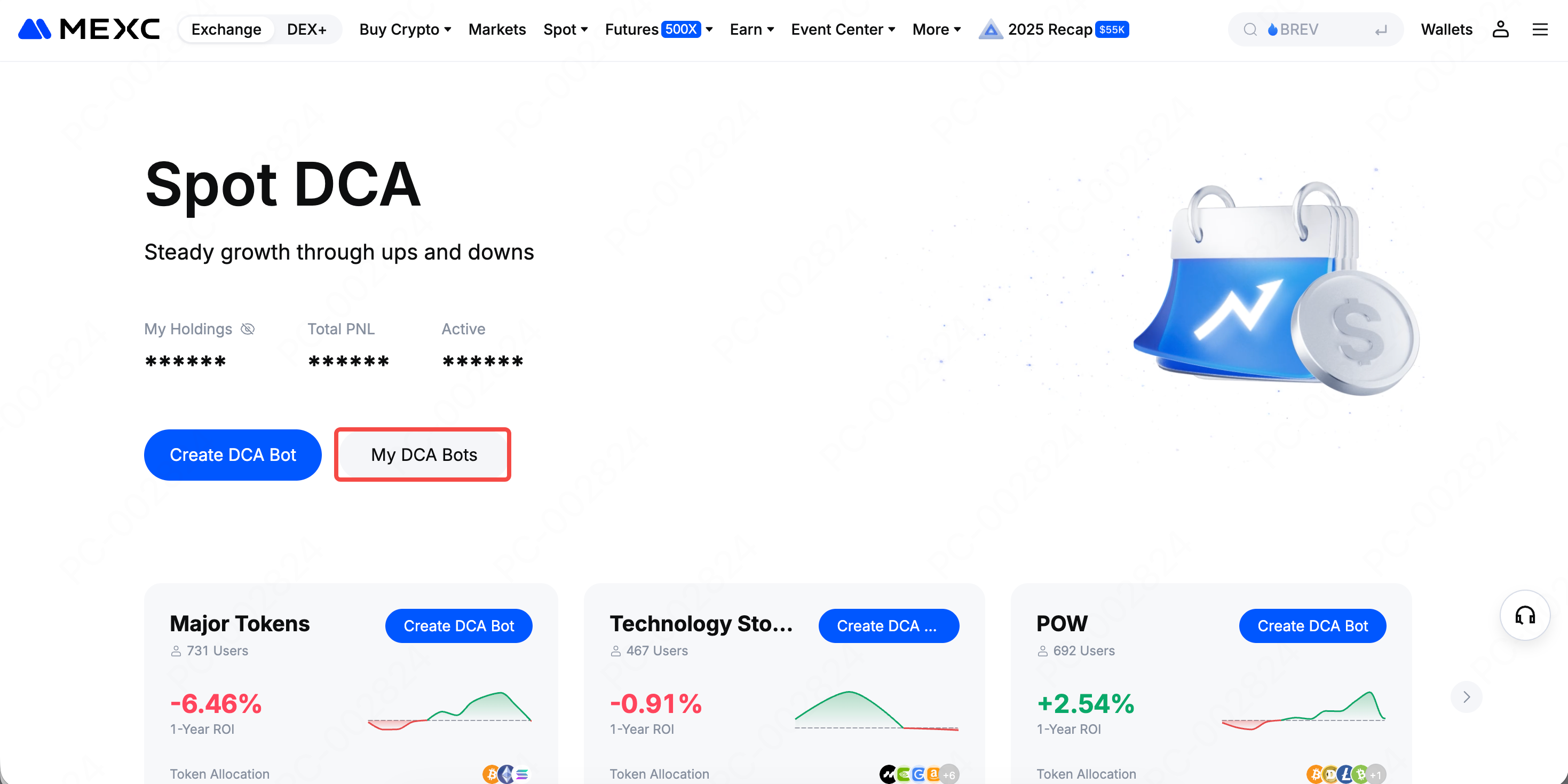Na página DCA Spot, clique em Meus bots de DCA para acessar a interface de negociação Spot.
