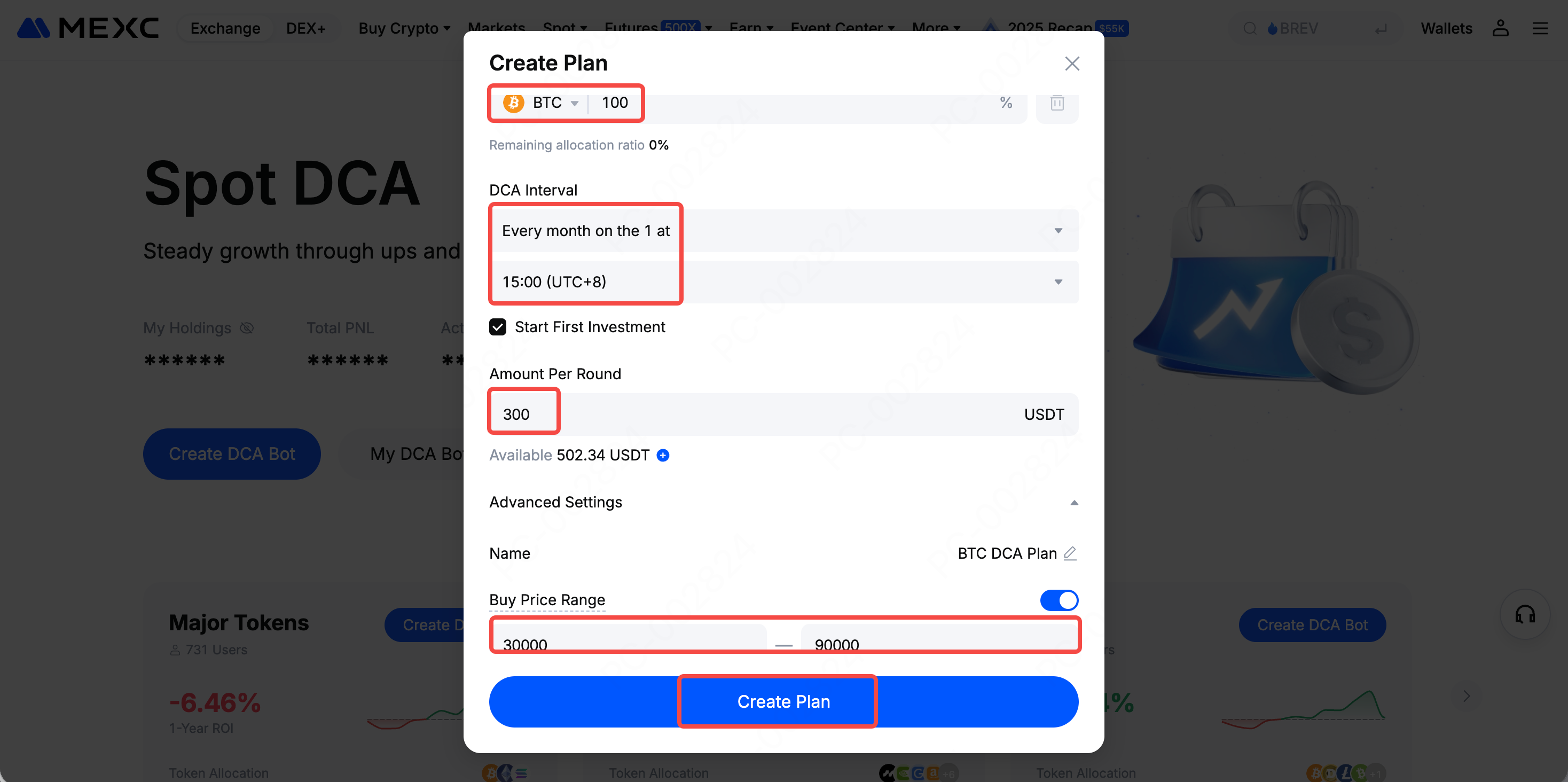 Defina o seguinte na página de criação: Escolha seus Tokens DCA(por exemplo, BTC, ETH), defina o Intervalo DCAe especifique o Montante por rodada. Para maior controle, acesse Configurações avançadas para definir um Intervalo de preço de compra, garantindo que as compras sejam executadas apenas dentro da sua zona de preço alvo. Após a configuração, clique em Criar plano.
