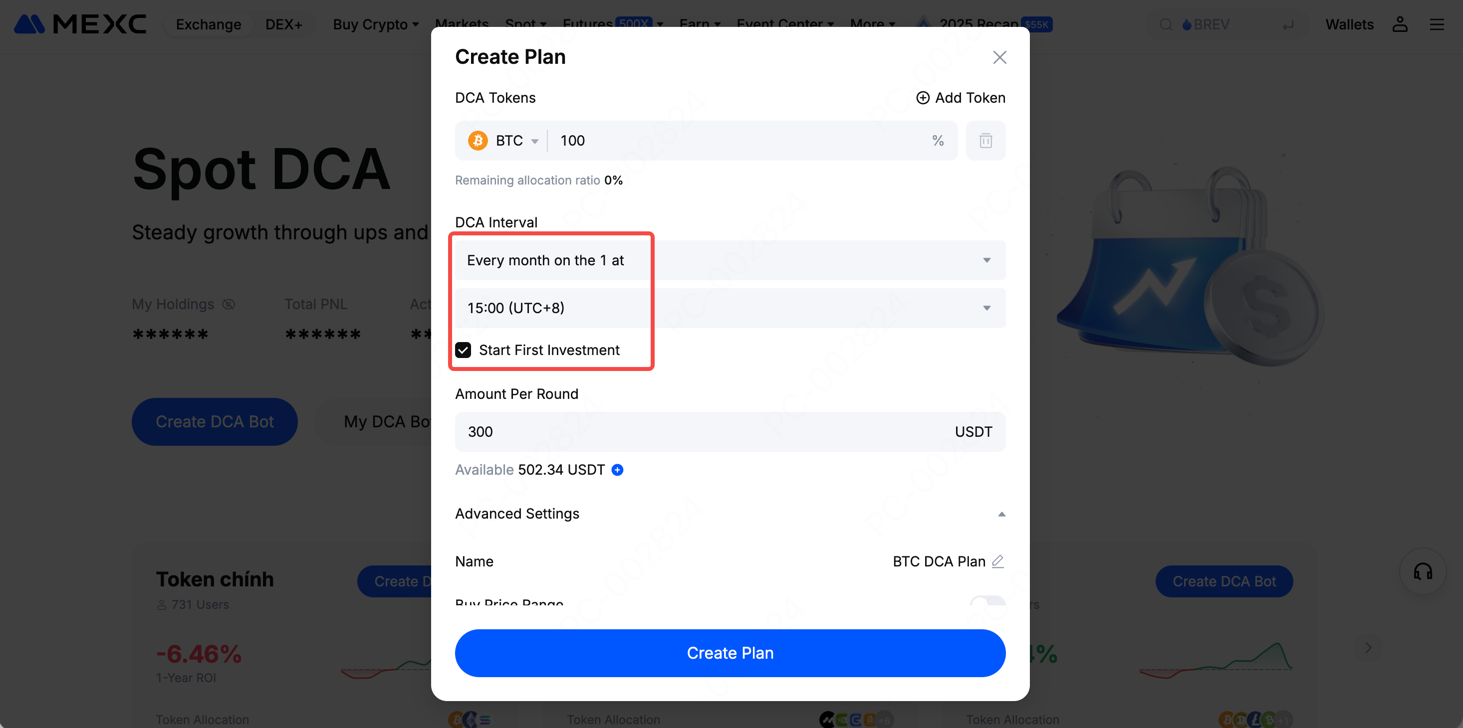 Tempo de execução: Para planos DCA diários, semanais ou mensais, o sistema define como padrão Iniciar primeiro investimento, executando a compra inicial após a criação do plano antes de continuar no ciclo programado.