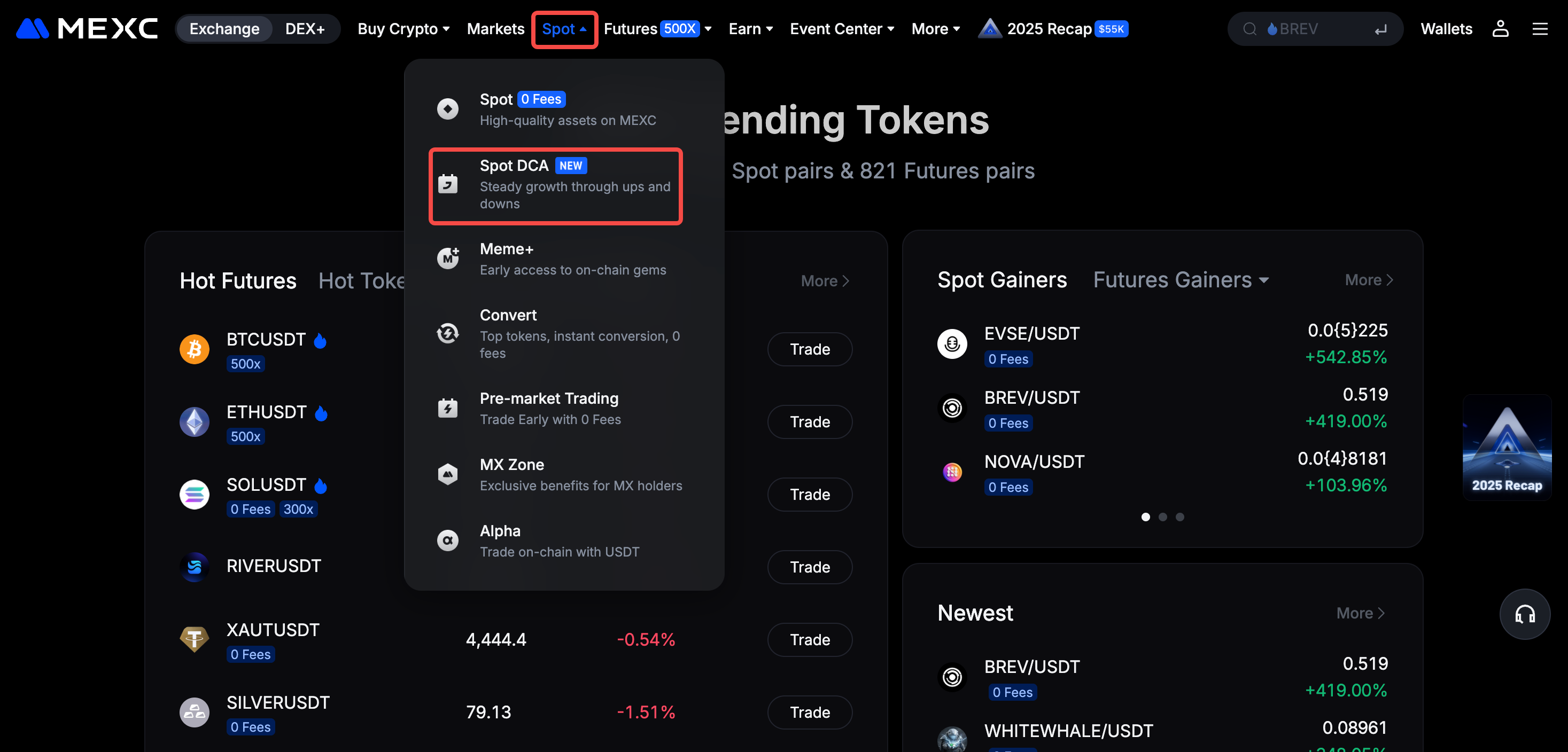 Inicie a sessão no site da MEXC, passe o mouse sobre Spot na barra de navegação e selecione DCA Spot no menu suspenso.
