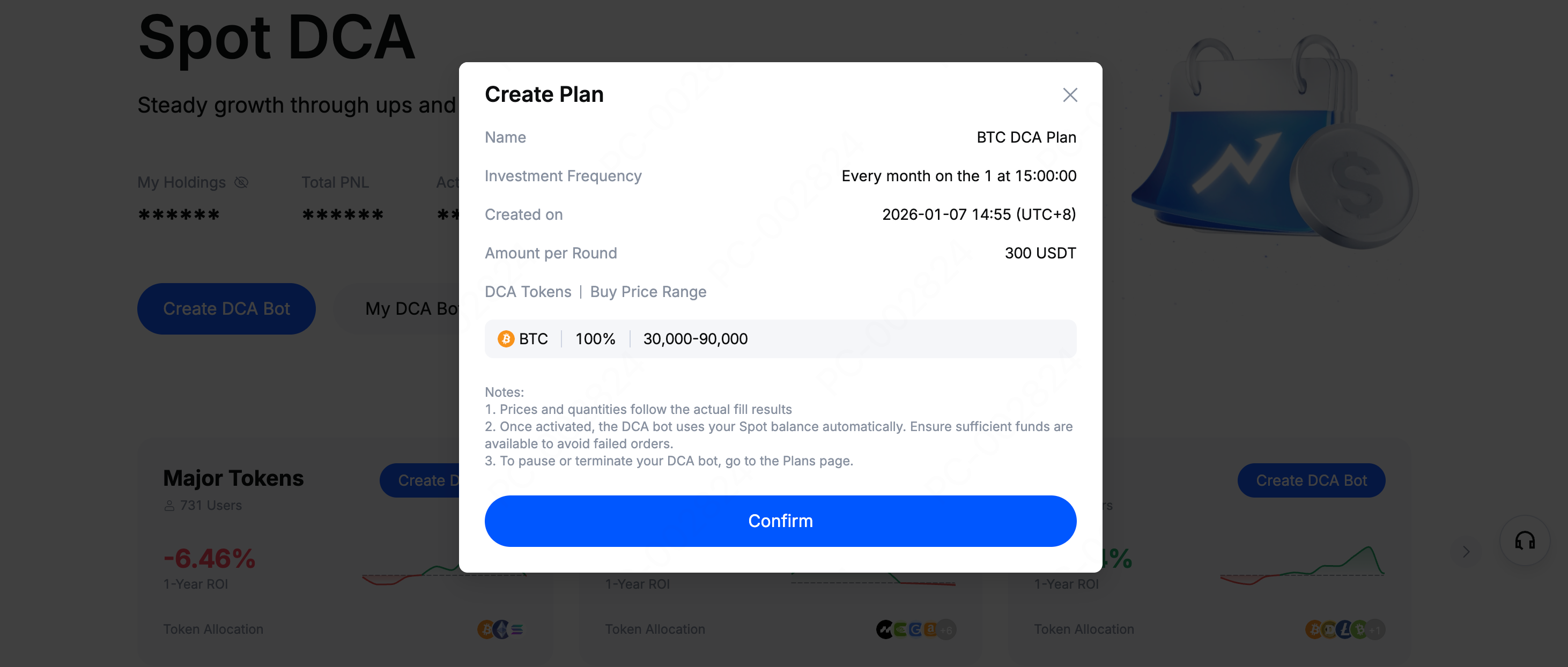 Revise cuidadosamente os detalhes do seu plano DCA. Após verificado, clique em Confirmar para ativar seu plano.
