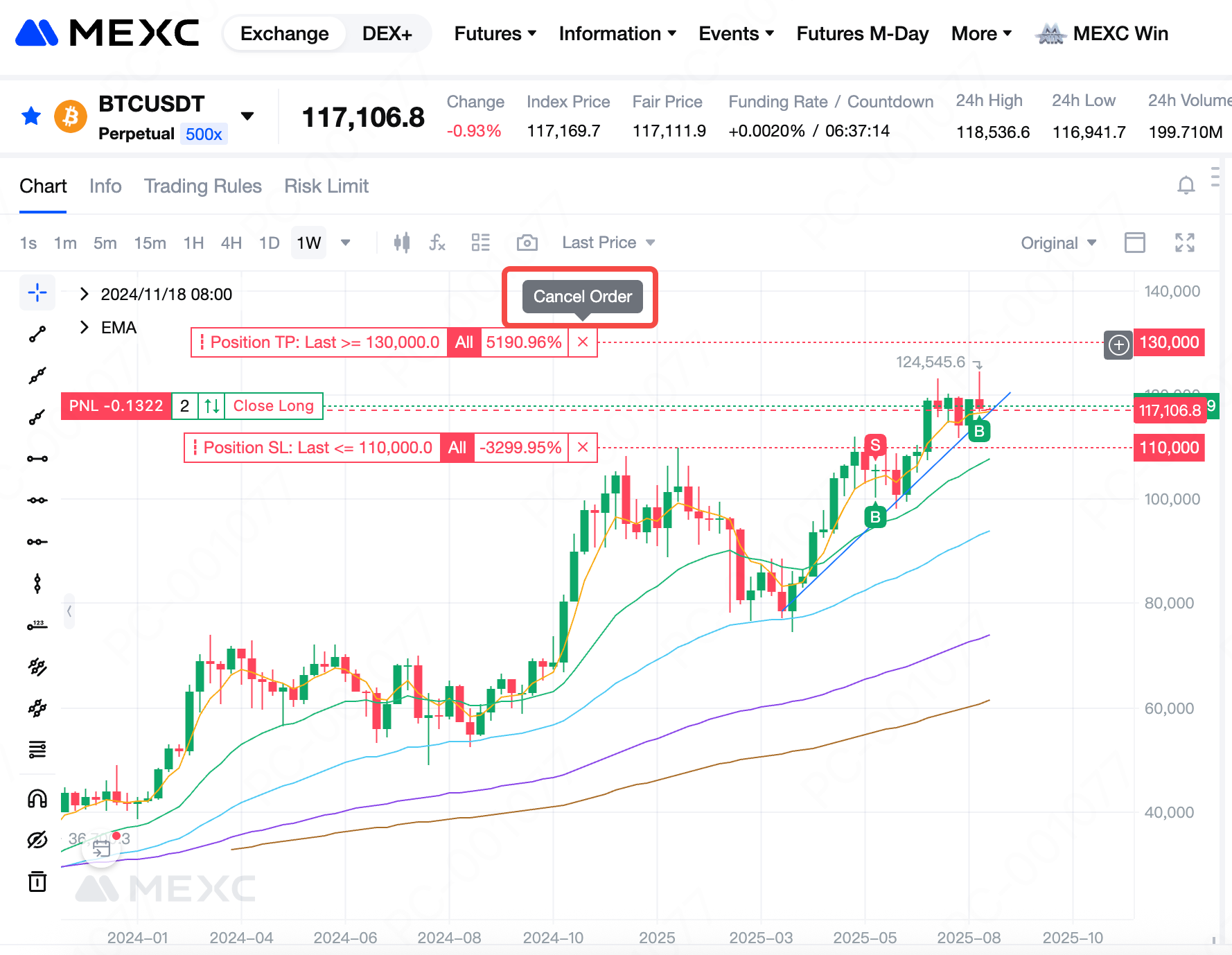 На свечном графике каждый значок лимитного ордера имеет кнопку X в крайнем правом углу. При наведении курсора на X появляется текст «Отменить ордер». Нажмите X, чтобы отменить ордер.