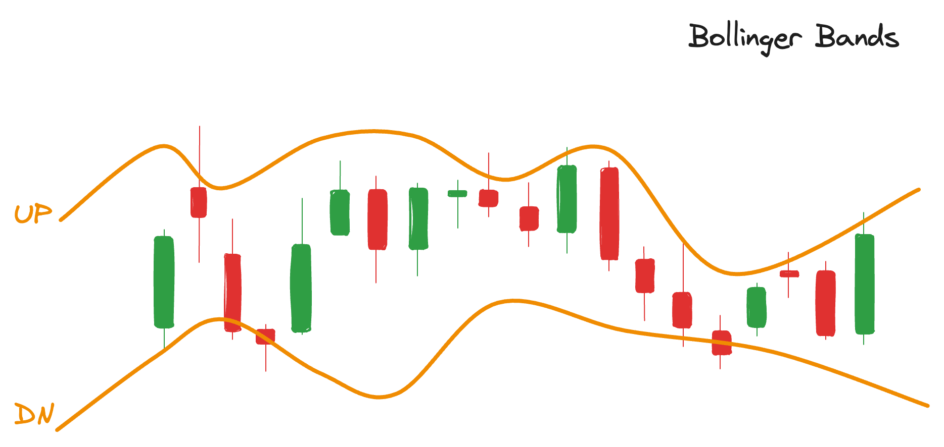Полосы Боллинджера (BOLL) измеряют волатильность рынка и определяют потенциальные условия перекупленности или перепроданности. Индикатор состоит из трех линий: верхней полосы (UP), средней полосы (MID) и нижней полосы (DN).