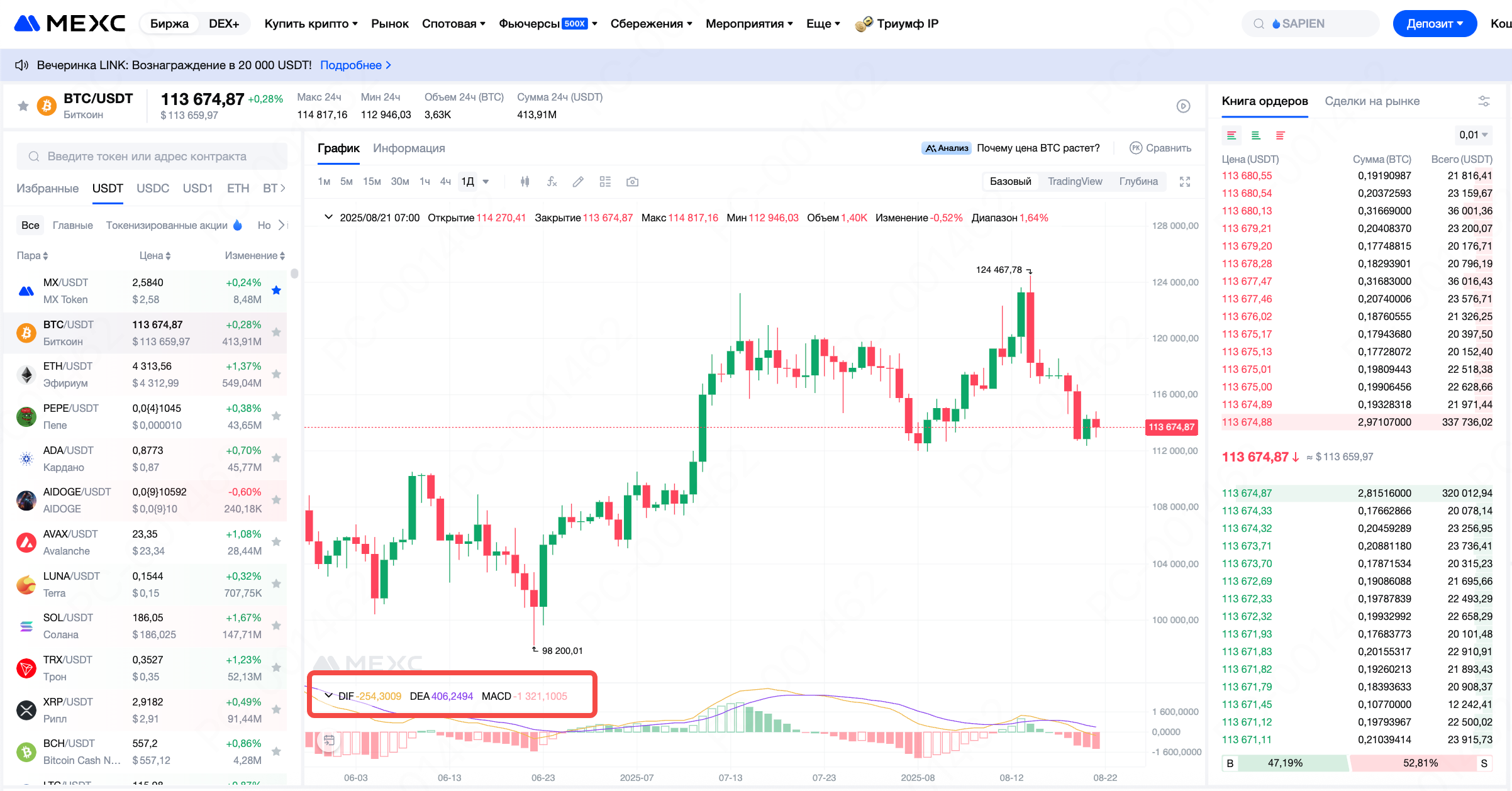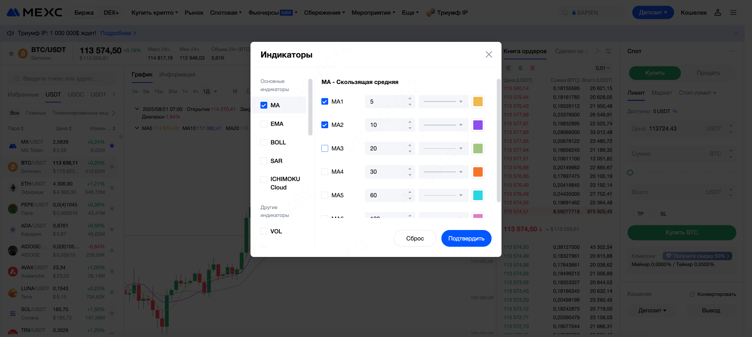 В торговле криптовалютами анализ технических индикаторов относится к количественному методу, который использует математические и статистические формулы для оценки рыночных тенденций. Обрабатывая данные о цене и объеме с помощью специальных расчетов, он дает инвесторам интуитивное понимание направления движения рынка. MEXC предлагает широкий спектр инструментов технического анализа, включая классические индикаторы, такие как скользящая средняя (MA), экспоненциальная скользящая средняя (EMA), расхождение скользящих средних (MACD), полосы Боллинджера (BOLL) и индекс относительной силы (RSI).