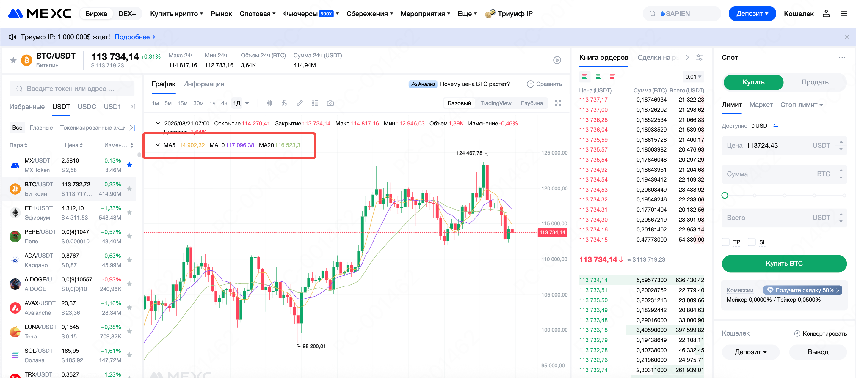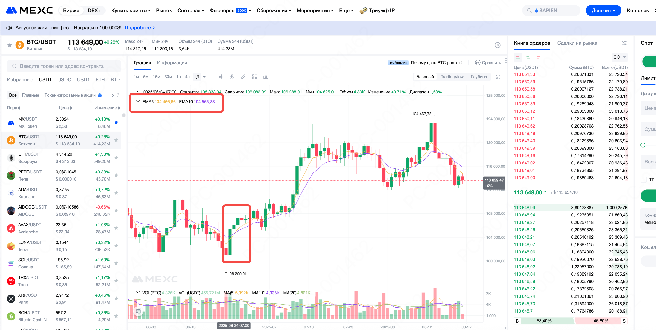 Пример: На примере BTC на дневном графике желтая линия представляет собой MA5. 5 августа цена BTC снизилась и коснулась линии MA5, быстро нашла поддержку, а затем резко отскочила, что свидетельствует о краткосрочном отскоке от скользящей средней.