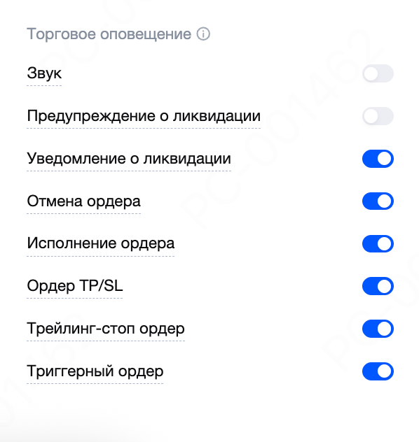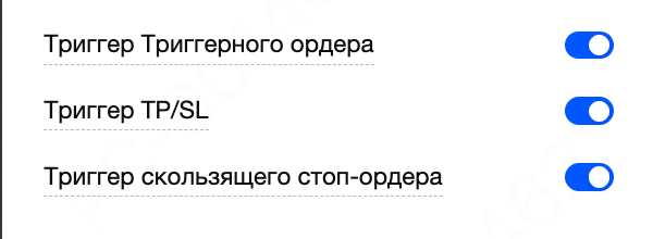 Если включить триггер ордера, ордера TP/SL или скользящие стоп-ордера (трейлинг-стоп), платформа будет уведомлять вас об успешном или неудачном срабатывании соответствующего ордера. Для каждого из них может быть создано до 20 оповещений в день.