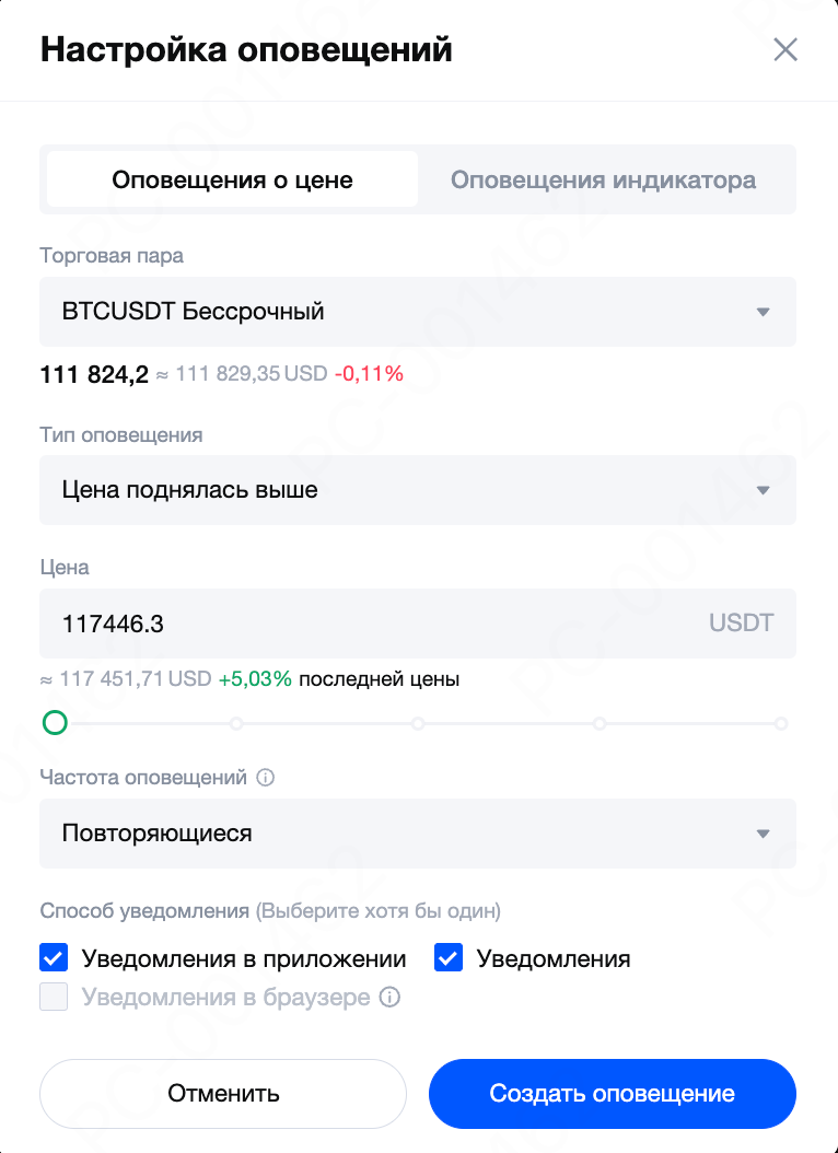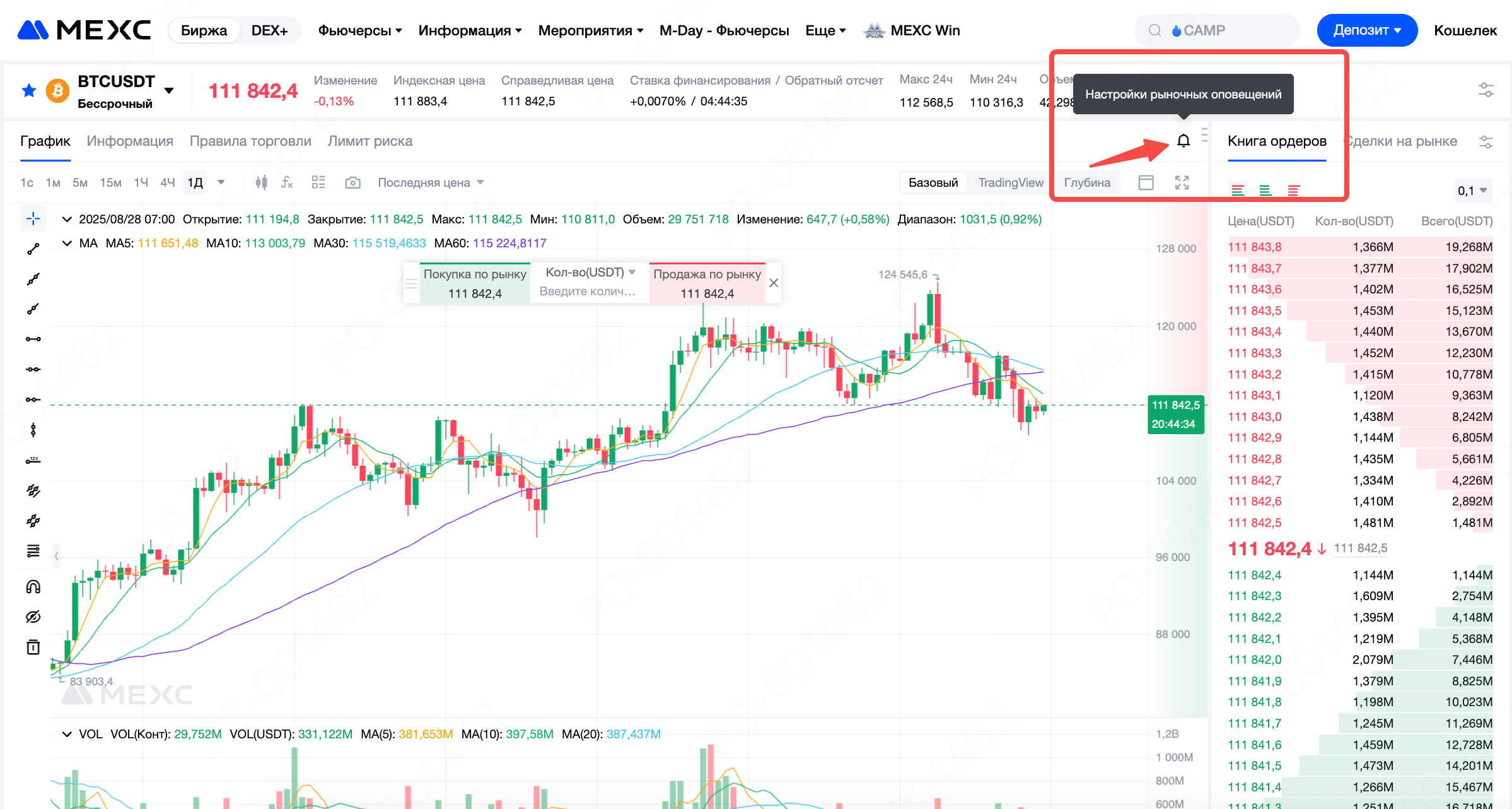 Кроме того, вы можете быстро настроить ценовые оповещения в правом верхнем углу торговой страницы.