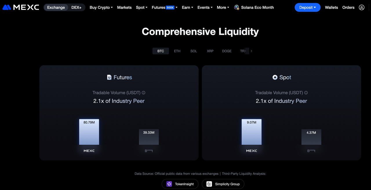 Например, на примере торговой пары BTCUSDT: при расчете общего объема лимитных ордеров в пределах ±5 базисных пунктов от средней цены, портфель ордеров MEXC составляет около 80,79 млн USDT, в то время как у глобального конкурента из топ-3 – около 39,33 млн USDT. Это означает, что ликвидность MEXC примерно в 2,1 раза выше, чем у лидера индустрии.