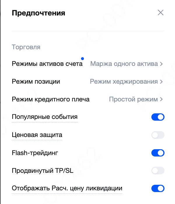 Торговые настройки включают в себя режим позиции, режим кредитного плеча, ценовую защиту, flash-трейдинг, продвинутый TP/SL и всплывающие окна подтверждения ордеров.