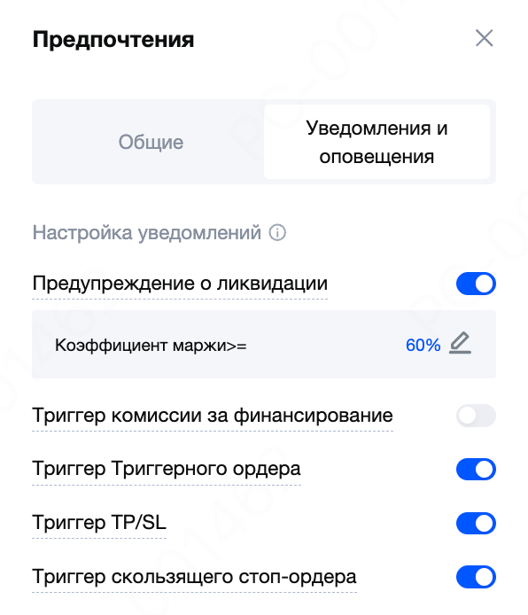 Настройки уведомлений включают предупреждения о ликвидации, триггер комиссии за финансирование, триггер ордера, триггер тейк-профита/стоп-лосса и триггер скользящего стоп-ордера.