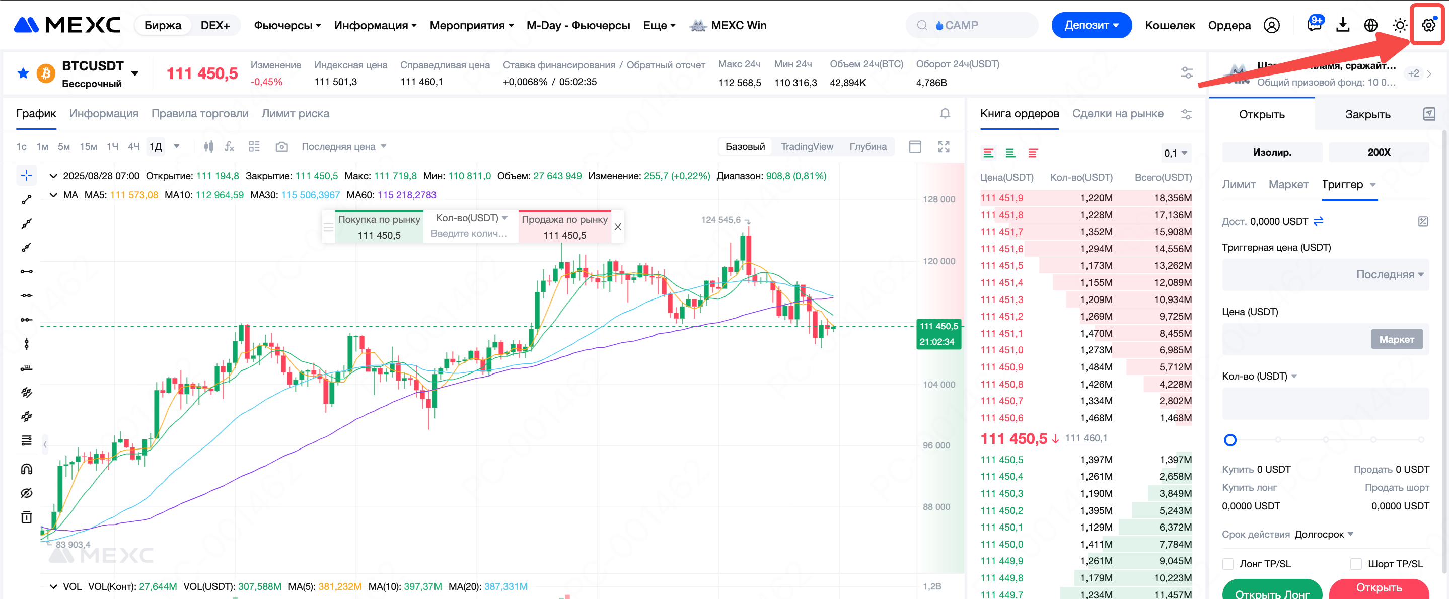 Для начала войдите на официальный сайт MEXC. На странице торговли фьючерсами нажмите на кнопку ⚙️ в правом верхнем углу, чтобы перейти на страницу настроек, где вы можете настроить различные вспомогательные функции, связанные с размещением ордеров.