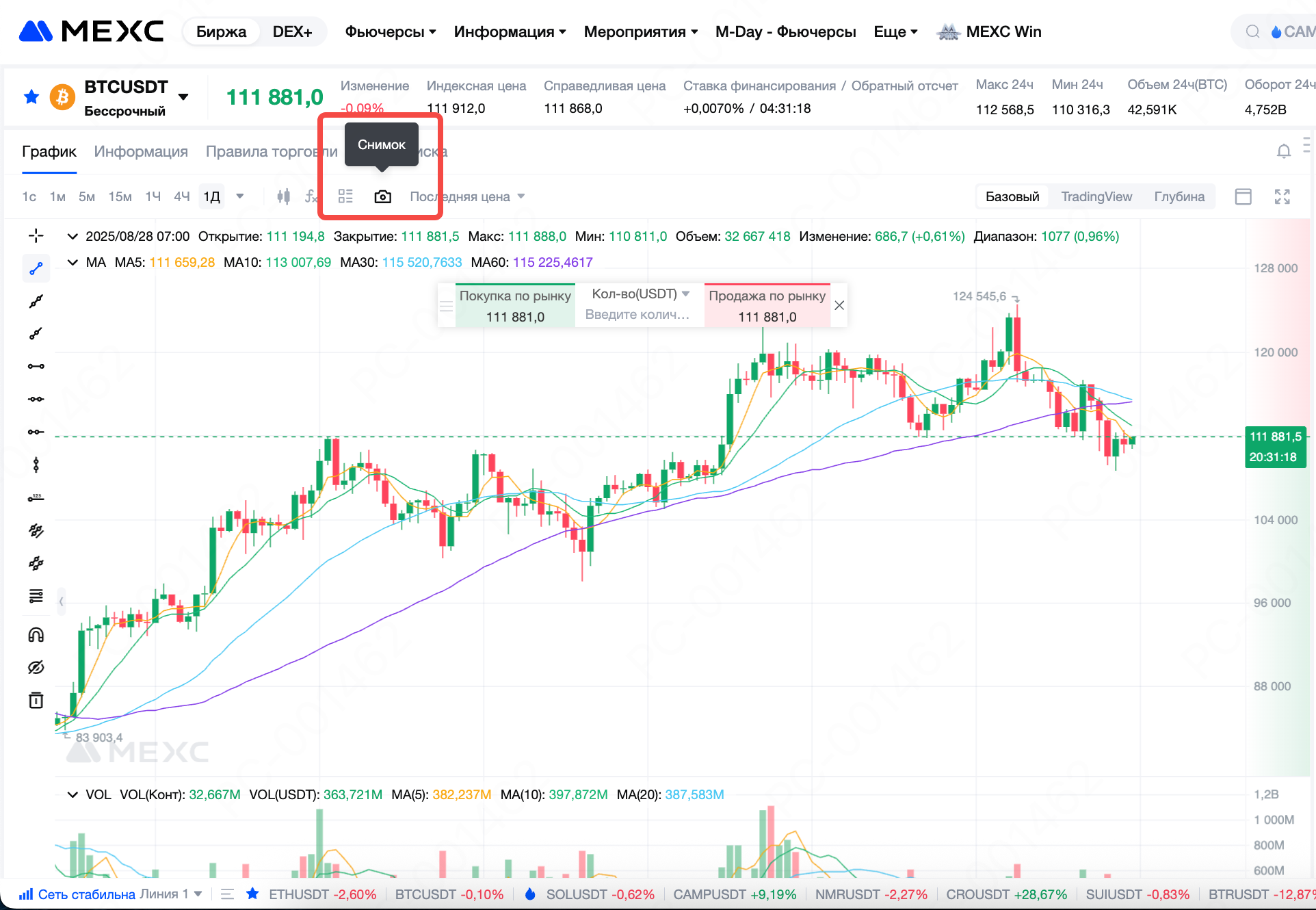 Как и в спотовой торговле, данную функцию можно использовать в сочетании с графическим инструментом. После создания чертежей на графике, отражающих ваши рыночные перспективы, вы можете нажать кнопку «Снимок», чтобы создать изображение текущего свечного графика, которым можно поделиться, что позволит вам быстро поделиться своим рыночным анализом.