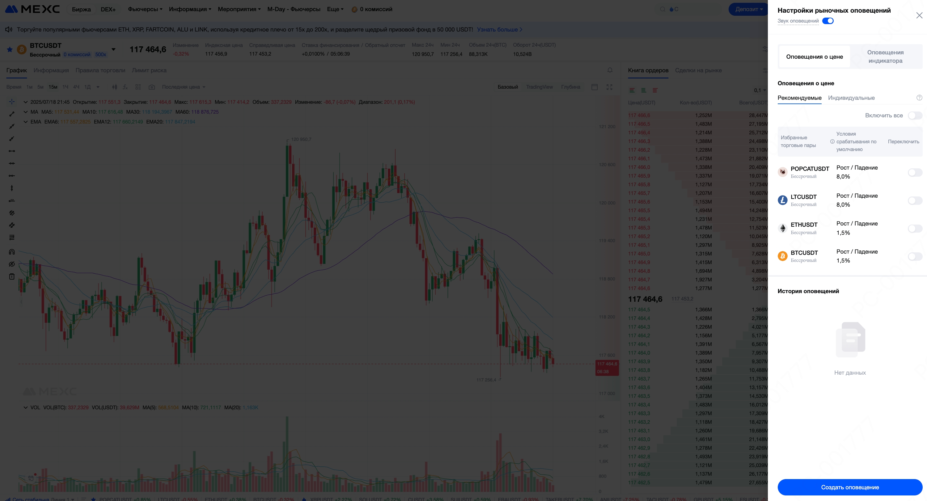 Для более опытных пользователей MEXC поддерживает автоматические оповещения на основе технического анализа: