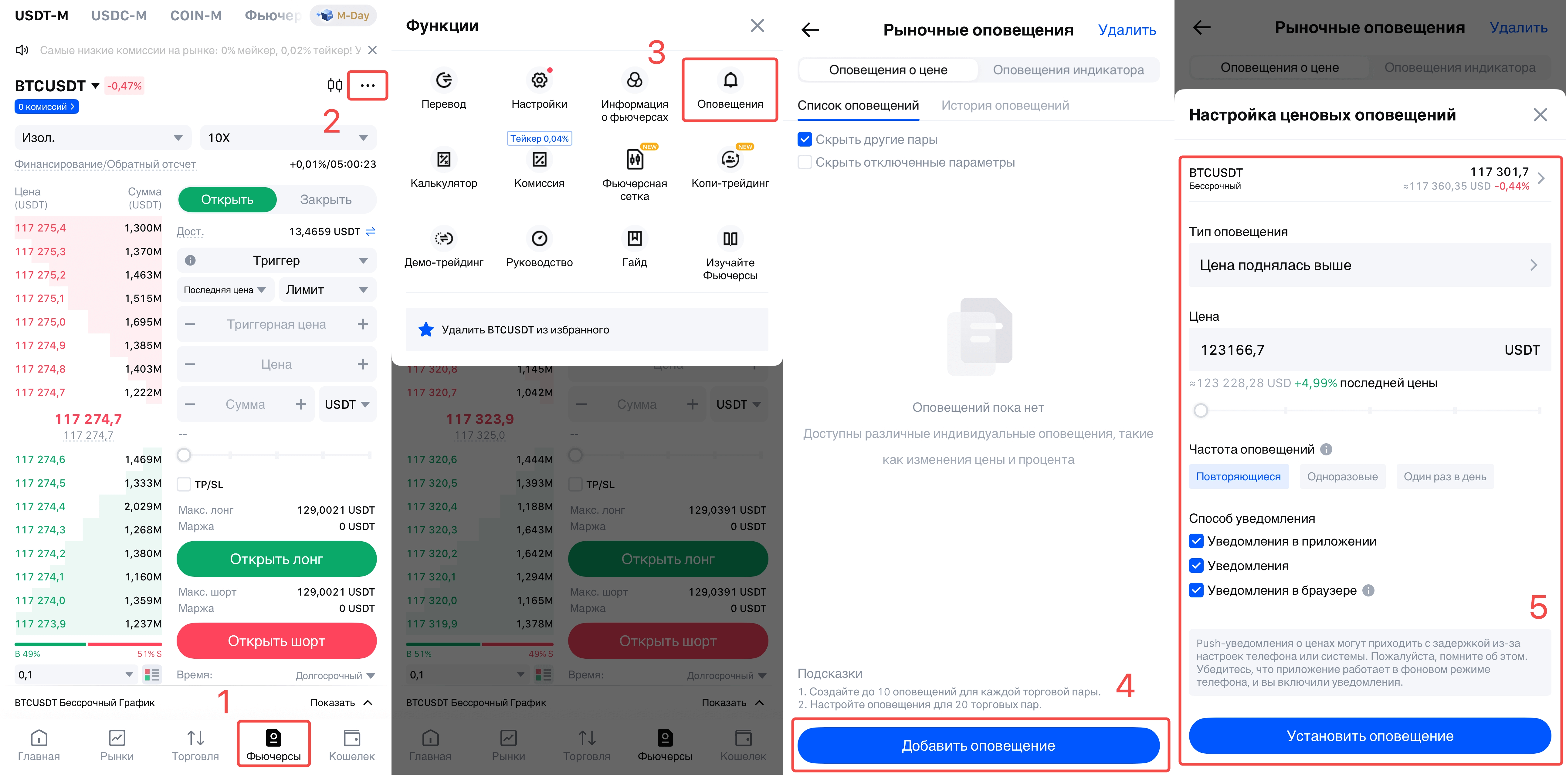Пользователь A устанавливает ценовое оповещение для BTCUSDT, чтобы получить уведомление, когда цена поднимется до 108 000 USDT. Когда цена достигает этого уровня, система немедленно отправляет уведомление, позволяя пользователю скорректировать кредитное плечо и вовремя зафиксировать прибыль. В отличие от этого, пользователь B, который не использовал оповещения, замечает движение цены только во время разворота, упуская идеальное окно для продажи и наблюдая, как прибыль исчезает.