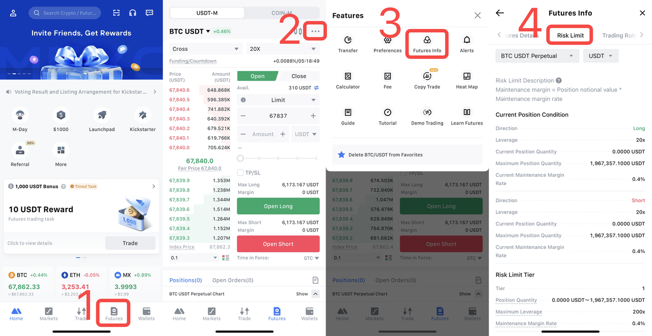 На официальном веб-сайте MEXC нажмите «Фьючерсы» в верхней панели навигации, чтобы перейти на страницу торговли фьючерсами. Затем выберите «Лимит риска» и нажмите «Просмотреть все лимиты риска по фьючерсам», чтобы получить доступ к подробностям об уровнях лимитов риска.