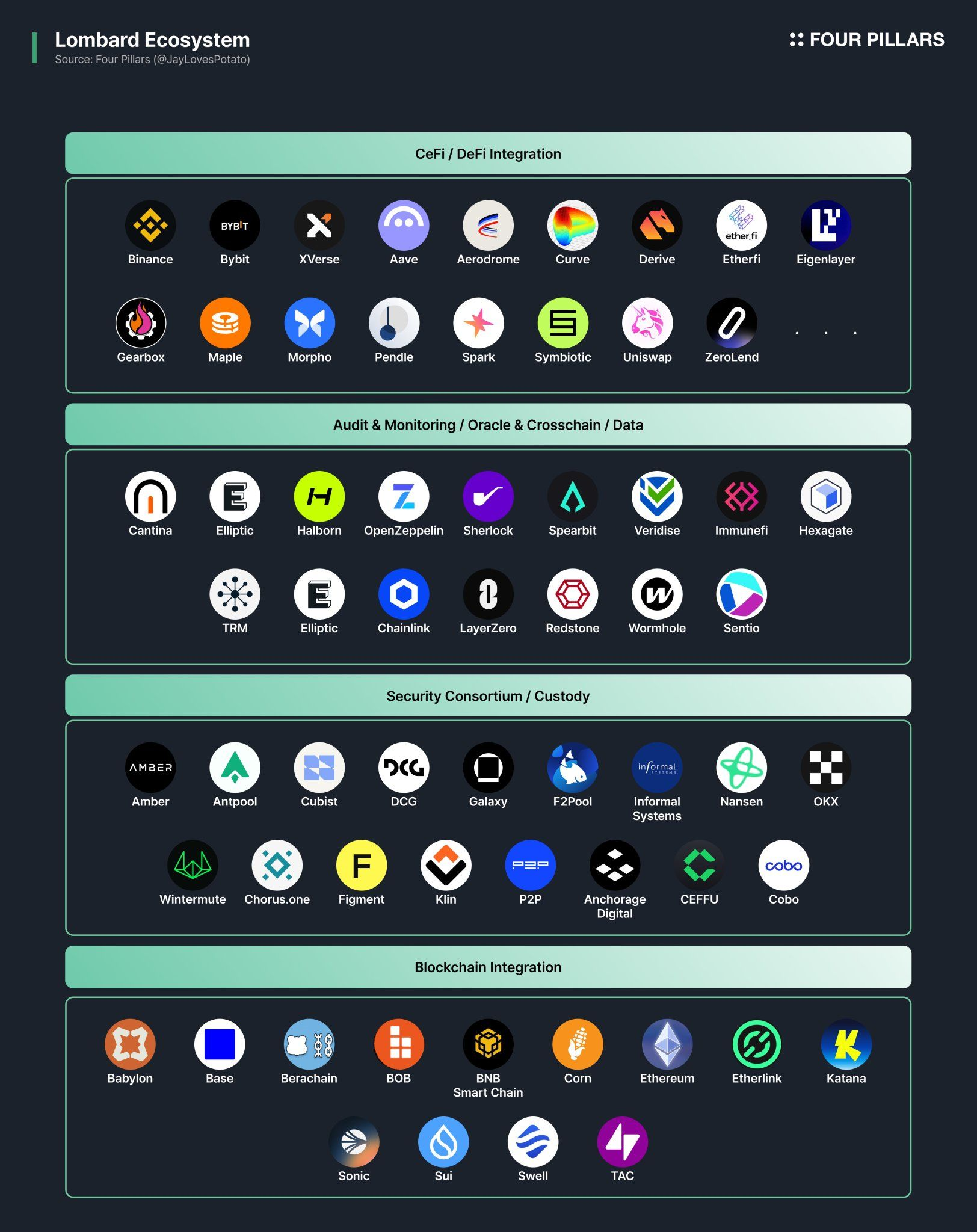 Успех Lombard основан на силе его расширенной экосистемы. На сегодняшний день более 80 ведущих протоколов DeFi интегрировали LBTC, в том числе: