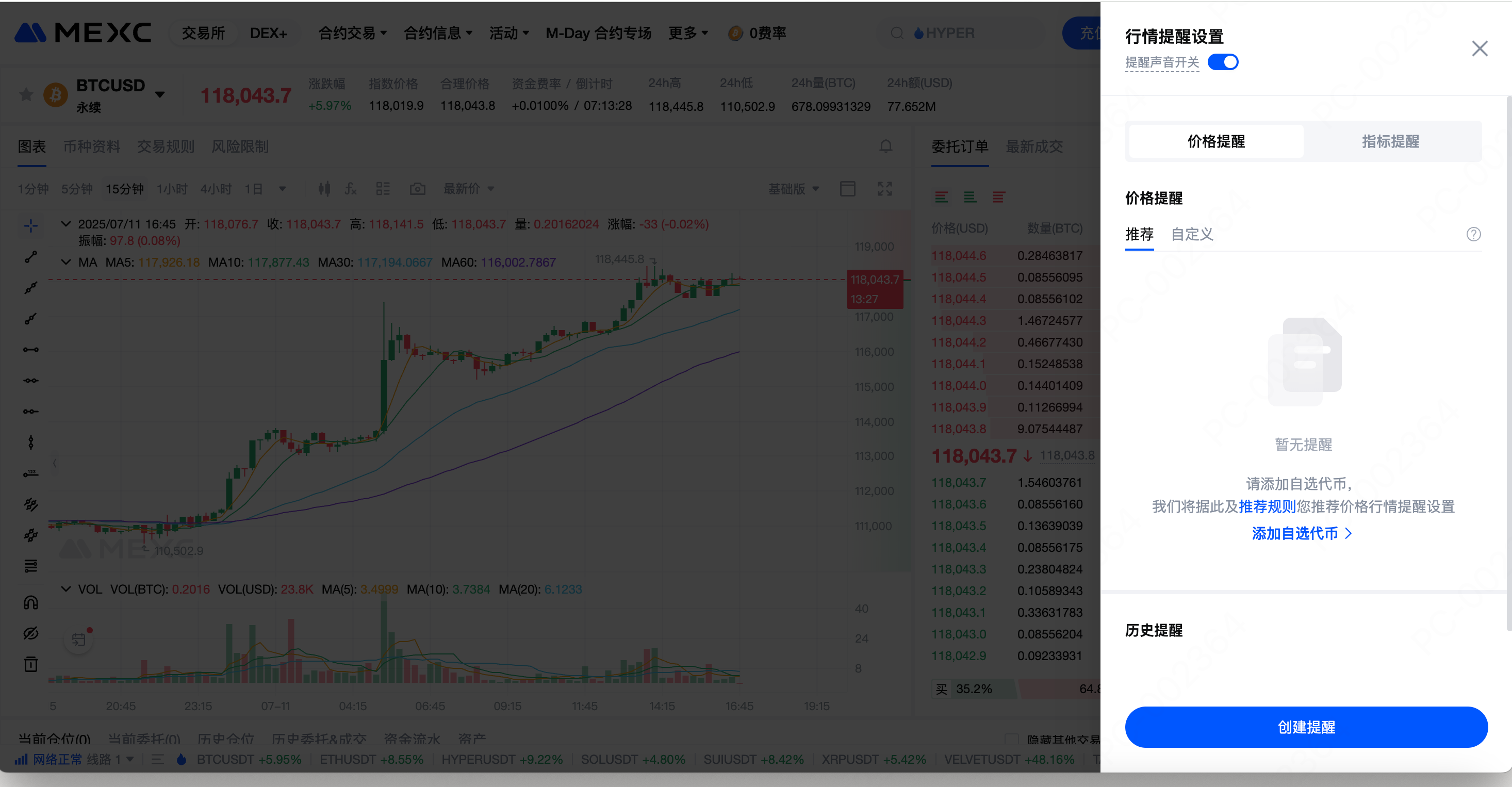MEXC, daha ileri düzey kullanıcılar için, teknik analiz temelli otomatik alarmları da destekler: